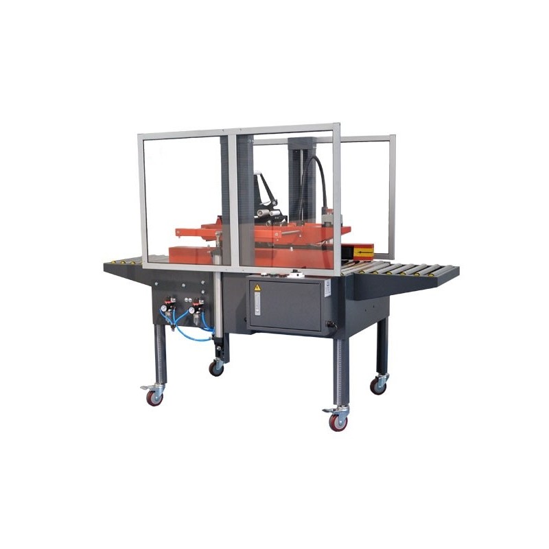 La cerradora o precintadora de cajas consta de una estructura básica metálica reforzada, con un cabezal precintador inferior insertado en un tramo de rodillos metálico que está a su vez unido a un puente metálico que soporta el cabezal precintador superior. Las cajas ya formadas son tomadas por un sistema de correas que las transporta longitudinalmente a través de la máquina para un rápido cerrado de las solapas inferiores y superiores quedando la caja formada y sellada.El ajusta en altura y en anchura se produce de forma automática.