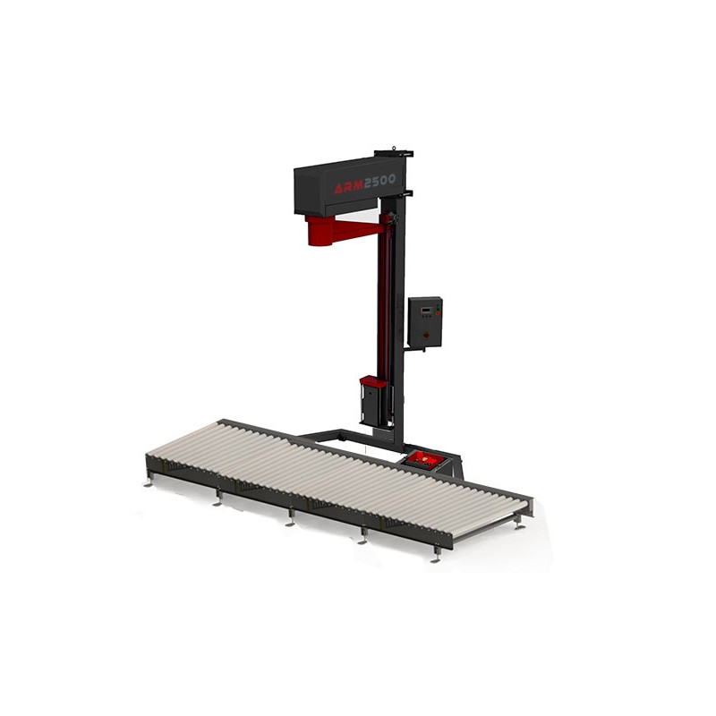 Envolvedoras o enfardadoras automáticas con brazo rotante: también conocidas como envolvedoras de brazo giratorio, son especialmente indicadas para cargas inestables al mantenerse el palet estático durante su retractilado. La carga a envolver es introducida y posicionada dentro del radio de giro del brazo. El brazo iniciará su giro, a la velocidad seleccionada según el tipo de enfardado elegido. La brazo continuará girando durante todo el ciclo hasta el punto final donde se realiza el corte del film manualmente. En la envolvedora o enfardadora ARM2500 la entrada, posicionamiento y salida de la carga es automática, con las interconexiones necesarias con transportadores y otras máquinas que conformen el sistema.